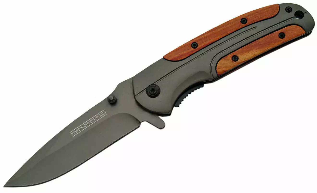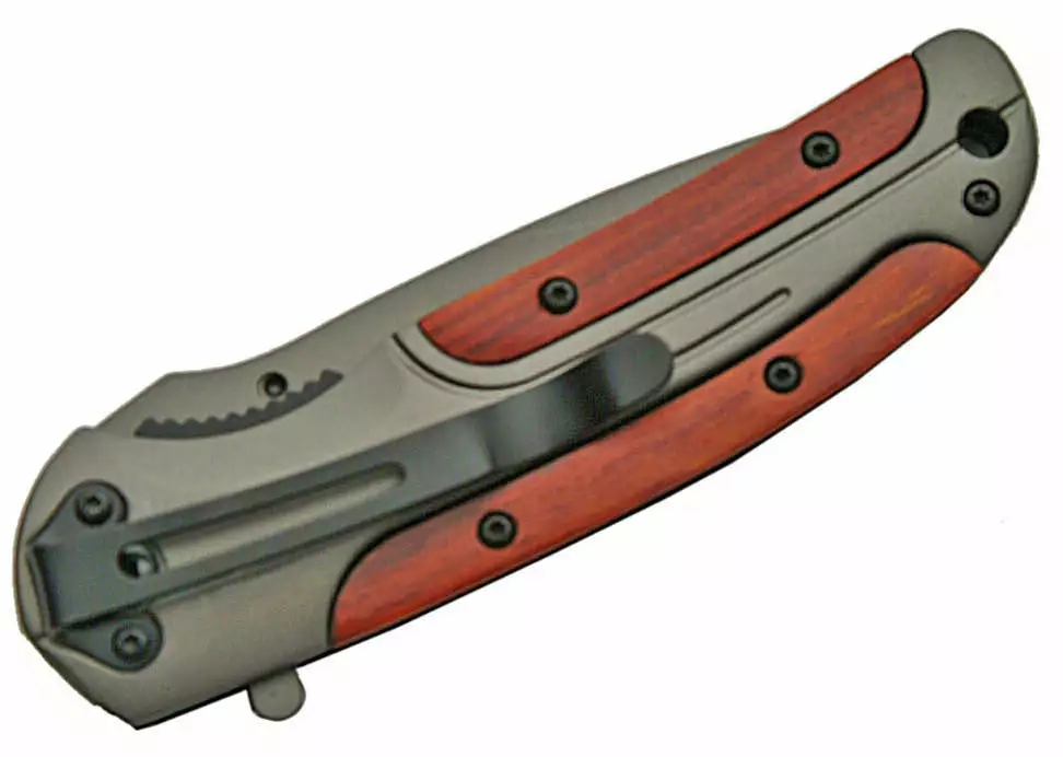 This liner lock looks as tough as it does high tech and classy. Not only does it look great it works like a horse to. This is not a cheap flimsy knife that will fold on you at the most inopportune time. These real wood handles and steel furniture combine to make this one outstanding looking knife.
