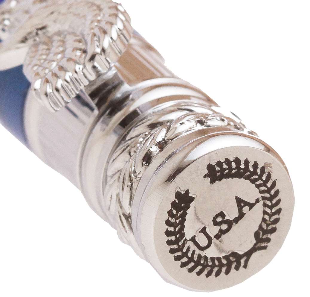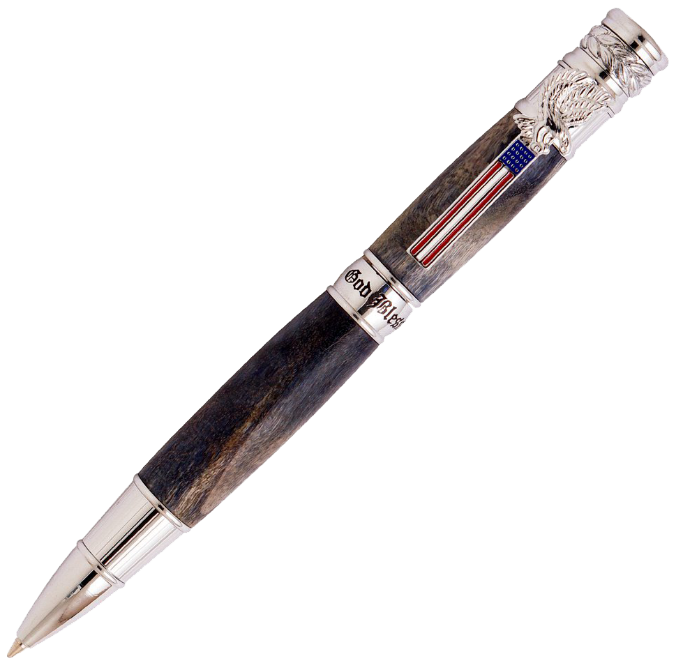 Proclaim your national pride and love of country with this most patriotic pen. Rich design details abound. The pen clip features a red, white and blue American flag and handsomely cast Bald Eagle emblem. The pen end features a laurel leaf, a symbol of victory and a popular motif in the Federal style of architecture. The pen top features an etched U.SA and laurel leaf stamp. Also on the tip and end are Doric column influenced designs, which appear on many American government buildings and monuments. Finally, God Bless America is intricately etched into the pen band. Excellent weight, balance and a smooth writing performance with a Parker style refill. Plus, the Antique Pewter finish is formulated to simulate the sophisticated sheen of time-worn pewter. The authentic patina and natural darkening brings out the details of the finish and creates a unique feel with a charm all its own. It will add a sense of warmth and history to your to your handmade creation.Required Accessories: