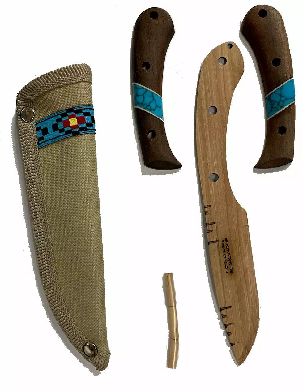 7.5″ overall length. 3.5″ blade length. Natural wood blade. Walnut and reconstituted turquoise handle. Three wooden pins. Canvas belt sheath. Complete working knife! Kits contains small parts, not suitable for small children. Adult supervision is required. For ages 7 and up.