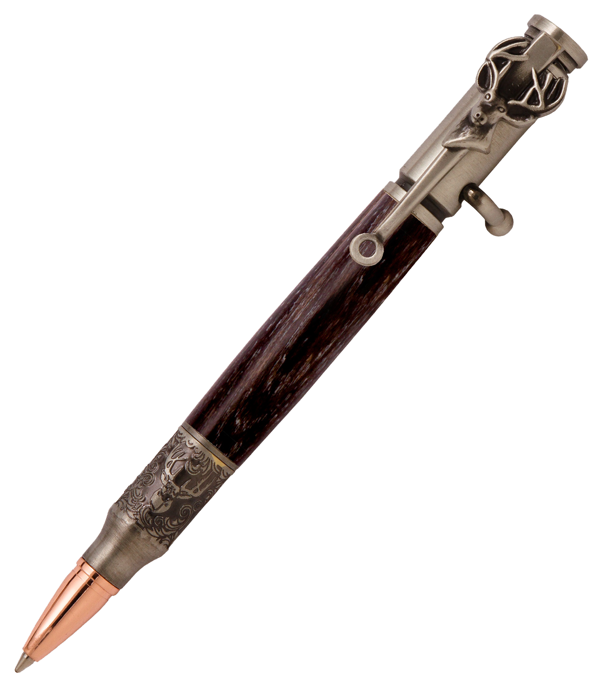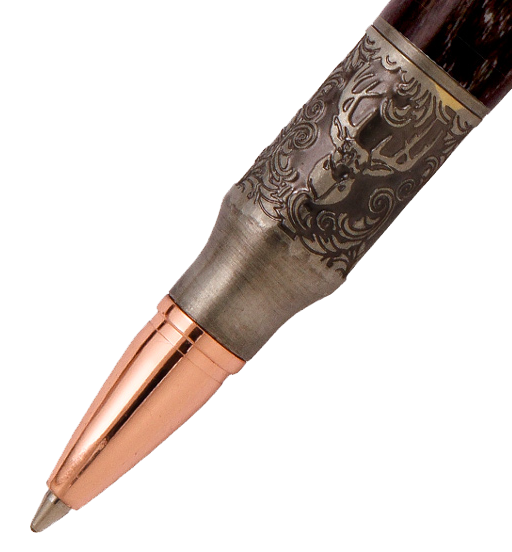 Without a doubt, the coolest pen a deer-hunting enthusiast will ever receive. The pen tip features a relief cut scroll engraving of an authentic trophy deer mount. The rustically antiqued plating brings out all the wonderful details of the engraved design. The design emulates the type of engraved game scene scrollwork found on real and highly sought after bolt-action rifles. We’ve capped off the deer themed design with a deer mount pen clip with a sight scope. The body and bolt action mechanism is the same as you will find in our original and best selling Bolt Action pen kits and uses all the same accessories. Plus, with its rich, warm copper finish and dark antique highlights, the details of this pen will surely impress.