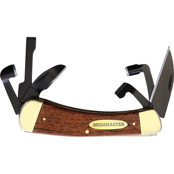 4.25″ (10.8cm) closed. Black finish high carbon steel tools include: detail blade, straight gouge, hook blade, V-scorp, gouge scorp, and chisel blade. Wood pattern resin handle with nickel silver bolster and inlay shield. Boxed.