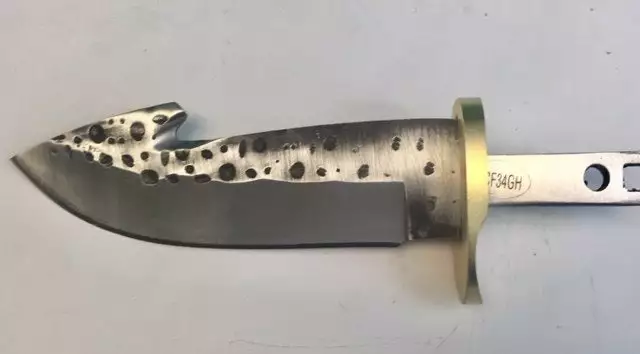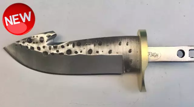 Great design hammered finished skinner. This blank is made of 7cr17MoV stainless steel, slotted fitted guard included and heavy construction. Sharpened blade and polished mirror finish. Great care was taken for the guard it is slotted so the blade can go inside the guard for tighter fit.Greater care is also given to the anchor hole you can use two different sizes of rod. Excellent blade. Drill, epoxy, shape and polish a real easy knife to start with. These were designed for our customers that want a great resell knife. Fit and finish is up to the maker.