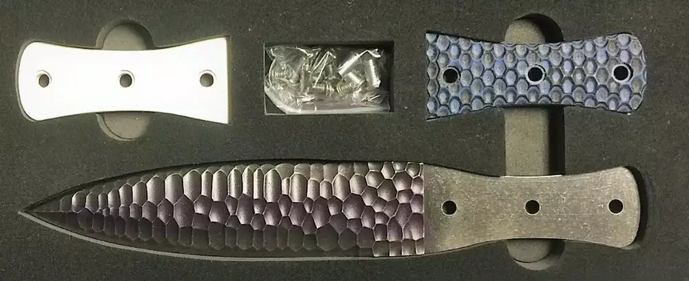 The “Zephyr” dagger. The Zephyr is named after the Greek God of wind and messenger of spring. This functional art dagger with the lines and elegance on ancient art conceals it deadly function. The design is from the bearing of kings and prices that wanted a unique design un-affordable by their subjects. This stunning dagger comes as a kit with two handle choices. Blue G10 handles and bone handles. The over all length is 8 1/2″. The double edged blade is 5 1/2″. It is made of a single billet that is 9 mm (0.35) thick, very thick. The process to make this blade is by computer numerical control (CNC) router. Each ridge and valley on the blade is individually cut out. Only six a day can be made. We then do a process called “stonewashed” it is a process that acid dips the metal to get it dark hue then we electroplate plate a titanium color for the finish color.Â