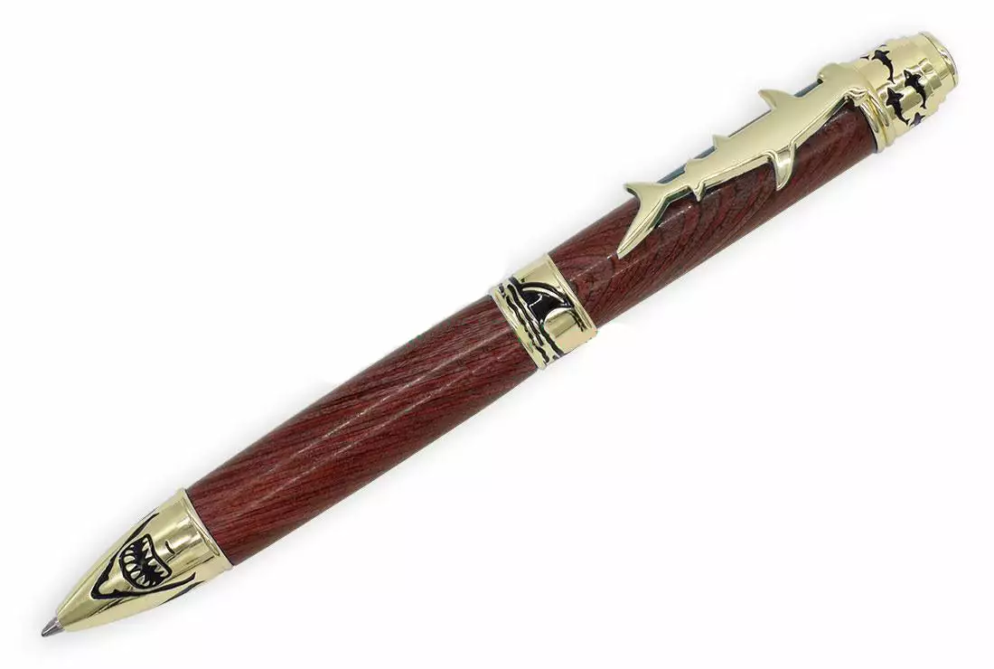 Gold & Black deep sea fishing pen kits. The pen tip is shark’s mouth and the center with the shark’s fin above the water line. The shape of shark’s head on the pen clip, the circling sharks on the pen cap. An Awesome deep sea fishing pen! We believe that most people will love this pen!