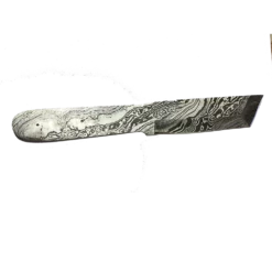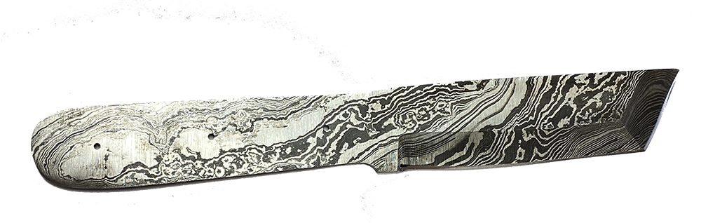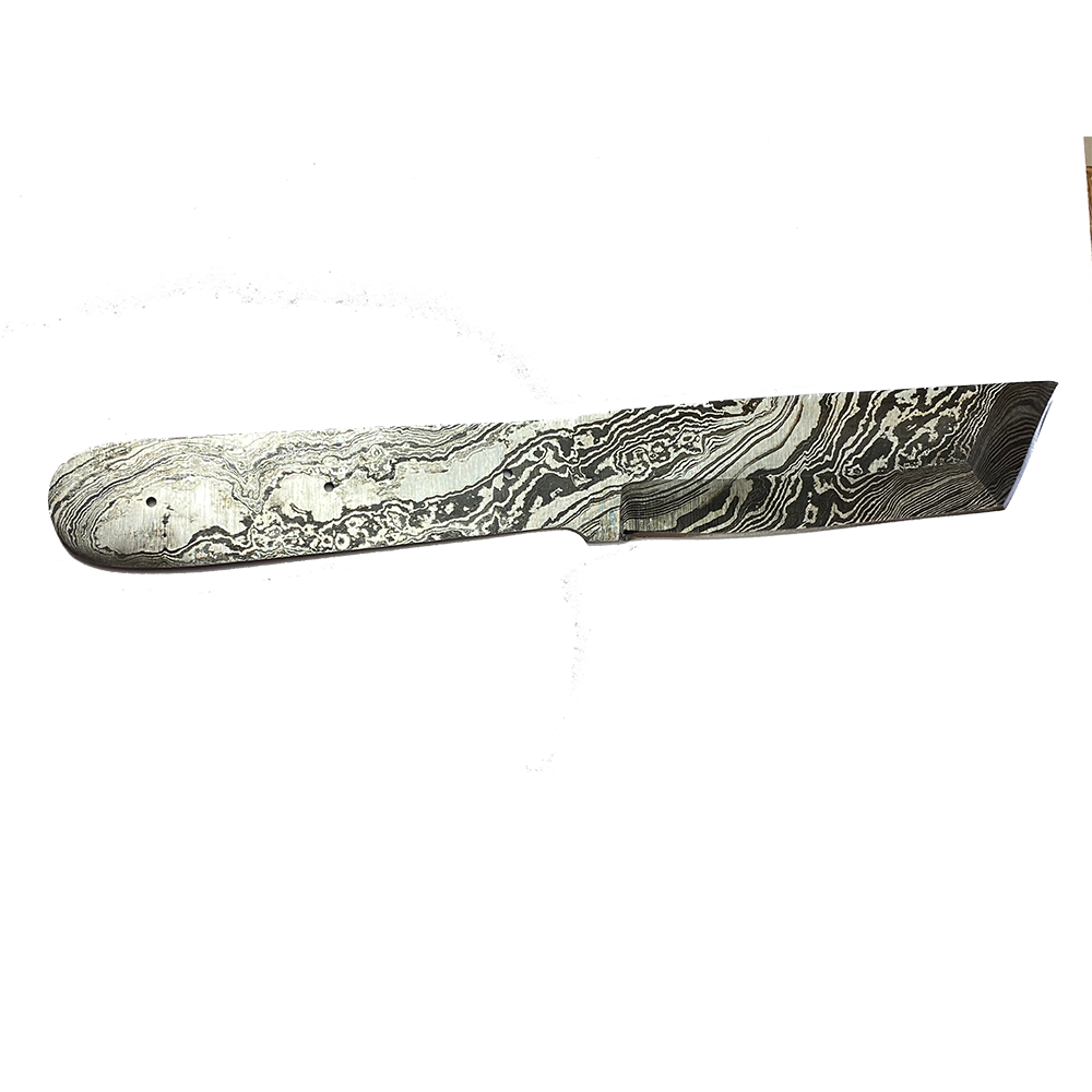 These blanks are full length Damascus (Not the cheap etched blades that many people are passing off as genuine Damascus blades. These blades have a 1095 high carbon & 1520 Stainless Steel with a high nickel content to highlight the patterns. There are approx. 250 layers due to folding of the steels. These blanks will sharpen and hold an edge like mad. We recommend washing and drying after use and then placing a couple of drops of oil to prevent rusting (Food Safe Oil recommended). The Nickle makes for a high contrast between layers. You can bring out the contrast in areas that were not dipped (Gray areas – end of handle) with a mild acid mixture or by leaving it sit in a coke for 3-4 hours. Be sure to neutralize the acid, clean and oil before using. Do not try this until you read more about etching process on the front page of www.woodworldtx.com under Etching Damascus in the menu on the left of the page.