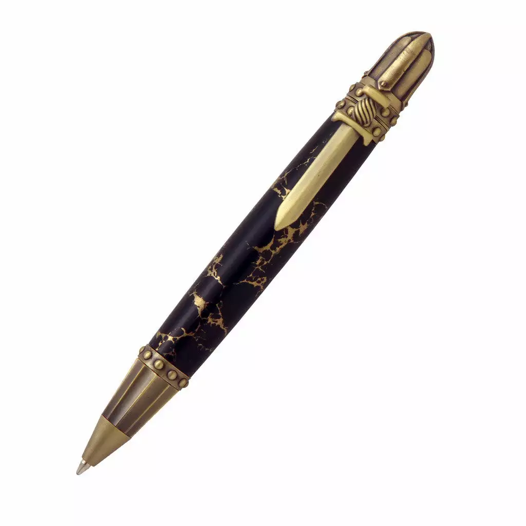 Here’s the perfect gift to conjure up the knights, soldiers and kings of medieval history and the lore of the battlefields of the Middle Ages. The meticulously handcrafted components feature period armor adornment including a medieval sword, a hand riveted replica knights helmet with a dome recess on the end, plus a fluted armor design on the pen tip. Easy to make with a single 3/8in. tube and smooth writing performance with a Parker style refill.