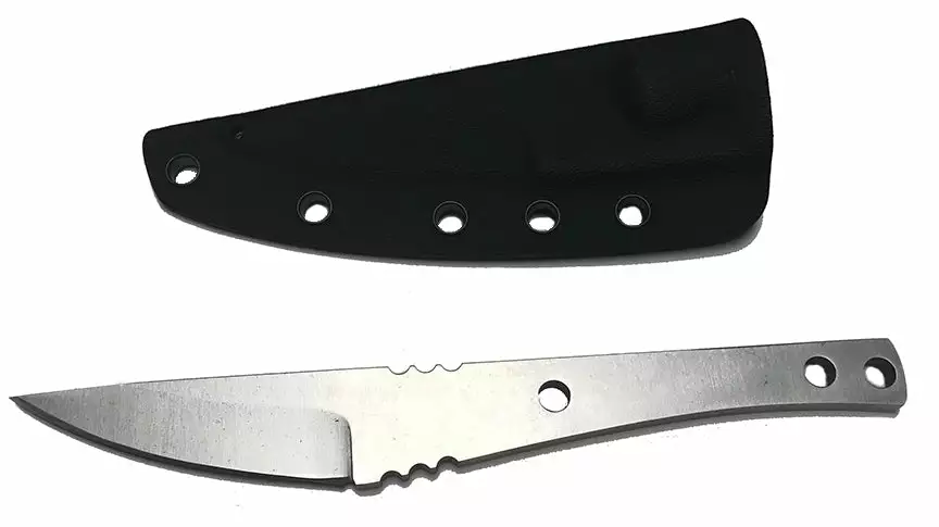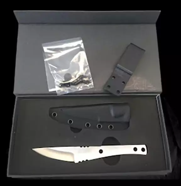 This bold knife has clean lines with ultra deep finger grooves. Made from durable D2, it comes with a Kydex like sheath, multi-position clip and all the hardware you need to attach your own handles (Just add wood or Acrylic Scales). Kit comes in an attractive gift box.