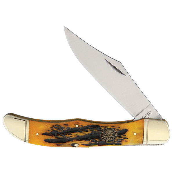 Type: Folding Hunter; Closed: 5.125″; Blade: 4″ l Stainless; Handle: Orange l Bone; Other Info: Inlay Shield. Orange jigged bone handles with nickel silver bolsters..