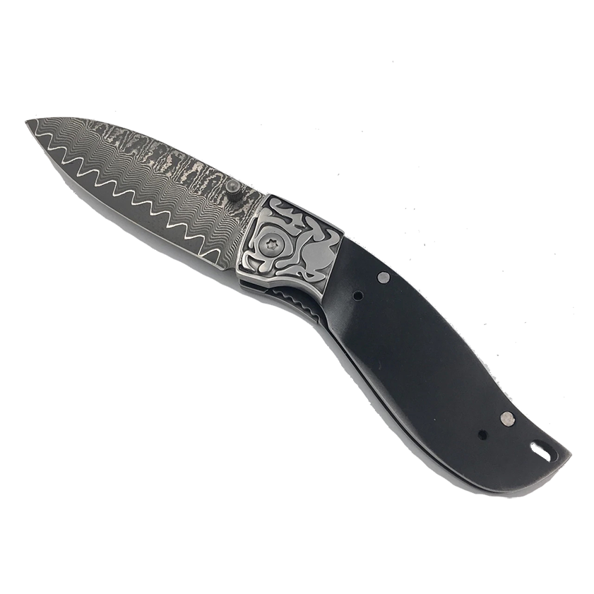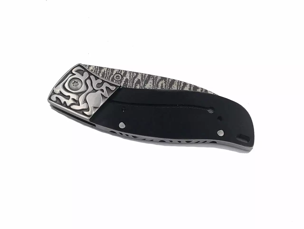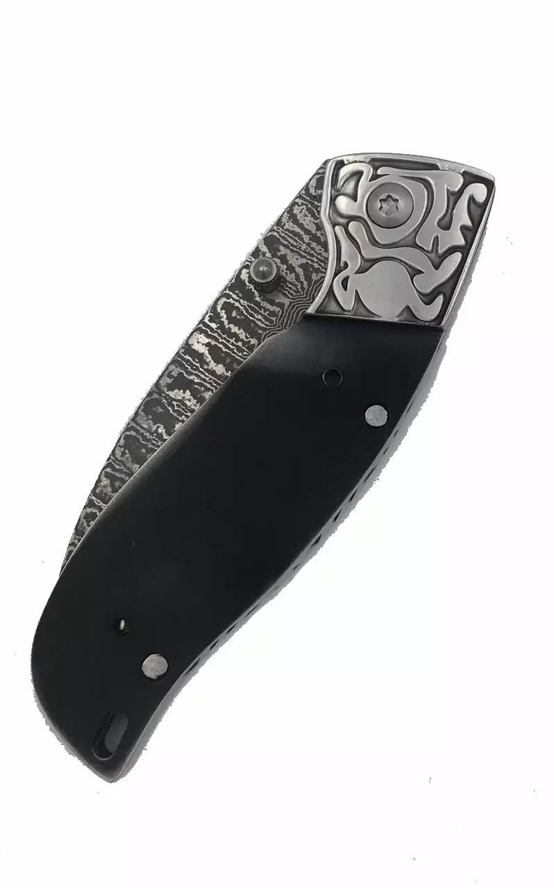 We attached stainless sculpted bolsters to accent the Damascus spine. Liner lock type mechanism. Attached thumb stud with file work on the spine and very sharp. Use rod or screws to fix handles.Â