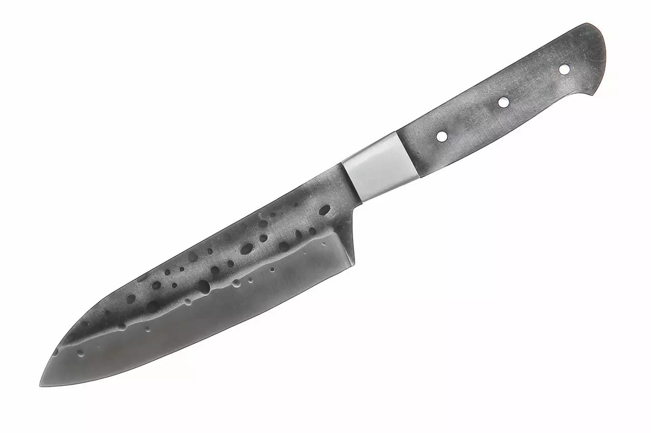 Each is handmade and the hammer pounded metal edge is reminiscent of the original meteorite blades. An extremely sharp knife, with an attached stainless steel bolster. This knife has weight, and is heavily constructed for years of use. This knife holds an edge and is a perfect companion for our Santoku Paring Knife