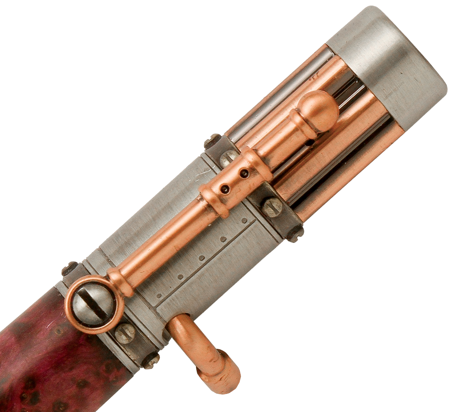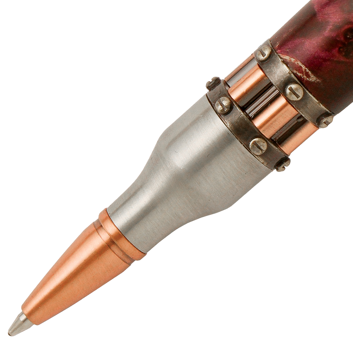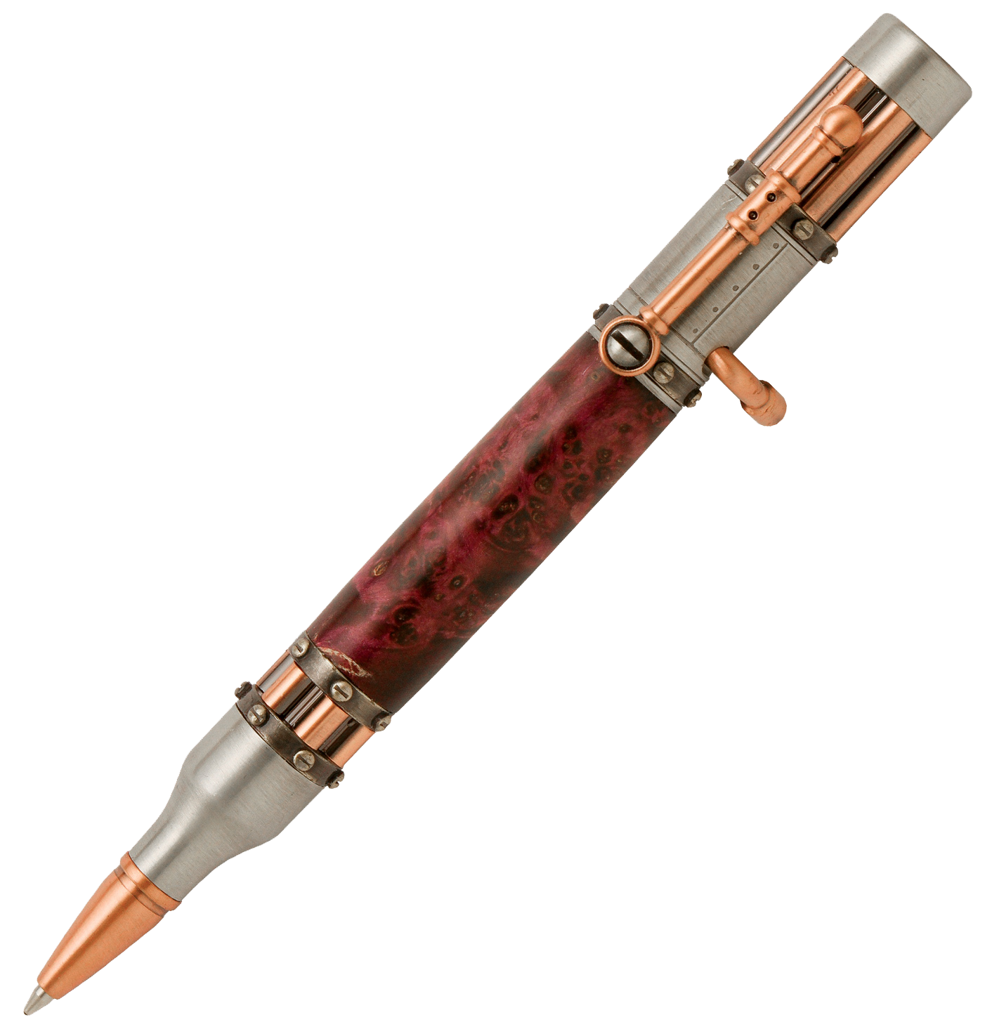 Here is a pen kit straight out of Victorian science fiction and the industrialized 19th century. The Steampunk genre has re-ignited a love of old fashioned materials and is all about mixing the old and new; fusing the usability of modern technology with the design aesthetic and philosophy of the Victorian age. We have designed our kit around this aesthetic; the kit combines flat head screws, riveted design patterns, replica Gattling gun barrels, a Bolt Action mechanism plus a mixture of industrialized Antique copper, pewter and brass finishes. Steampunk is a major trend in fashion, jewelry and design over the last few years – now is your chance to create the perfect pen as the ultimate Steampunk gift. Smooth writing performance with a Parker style refill.