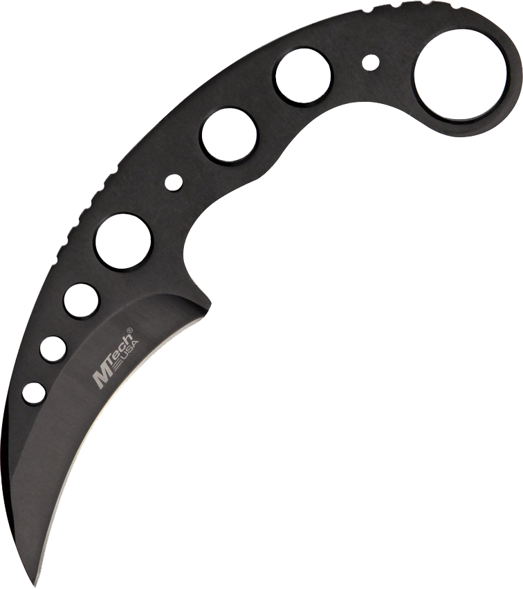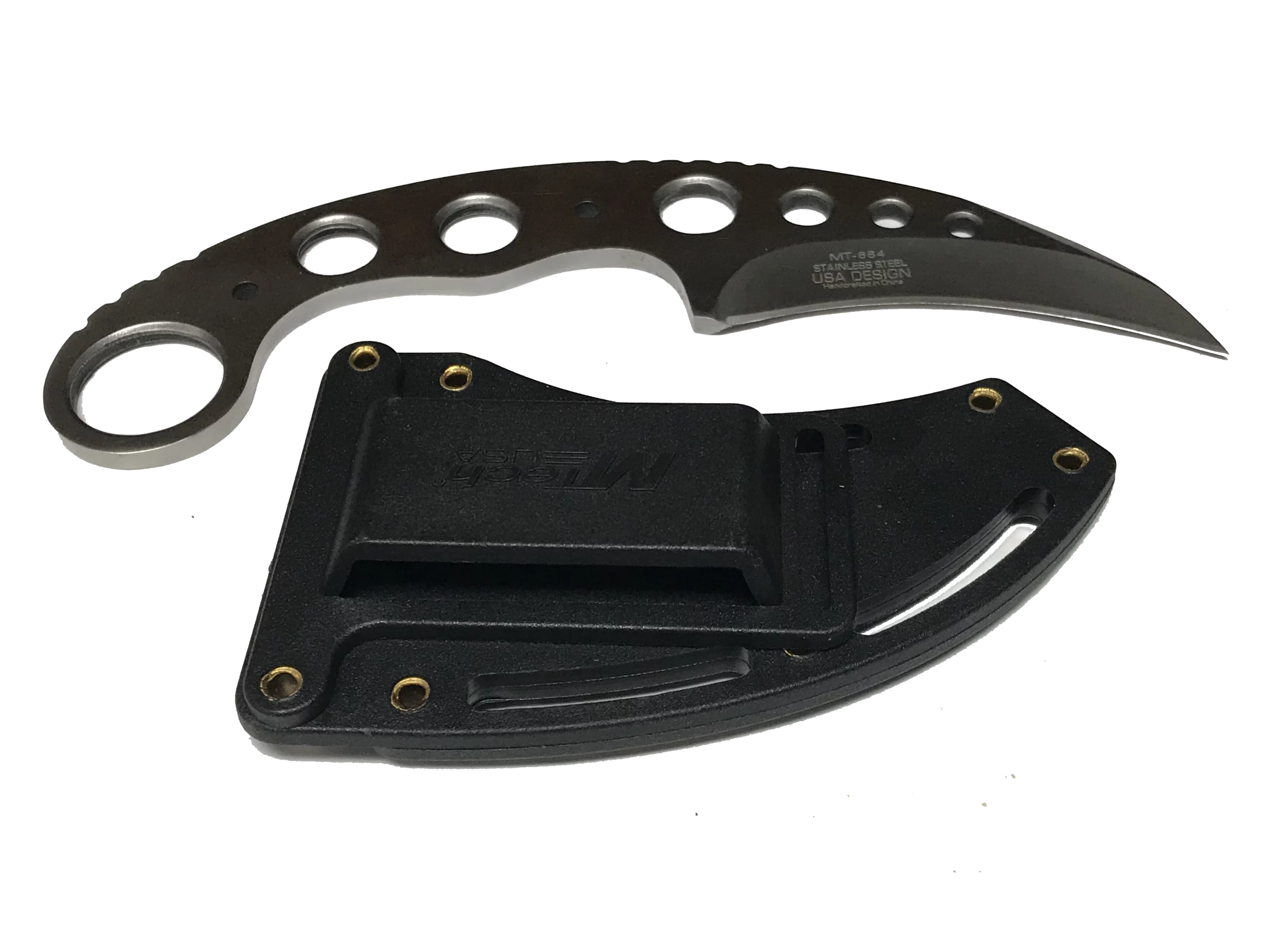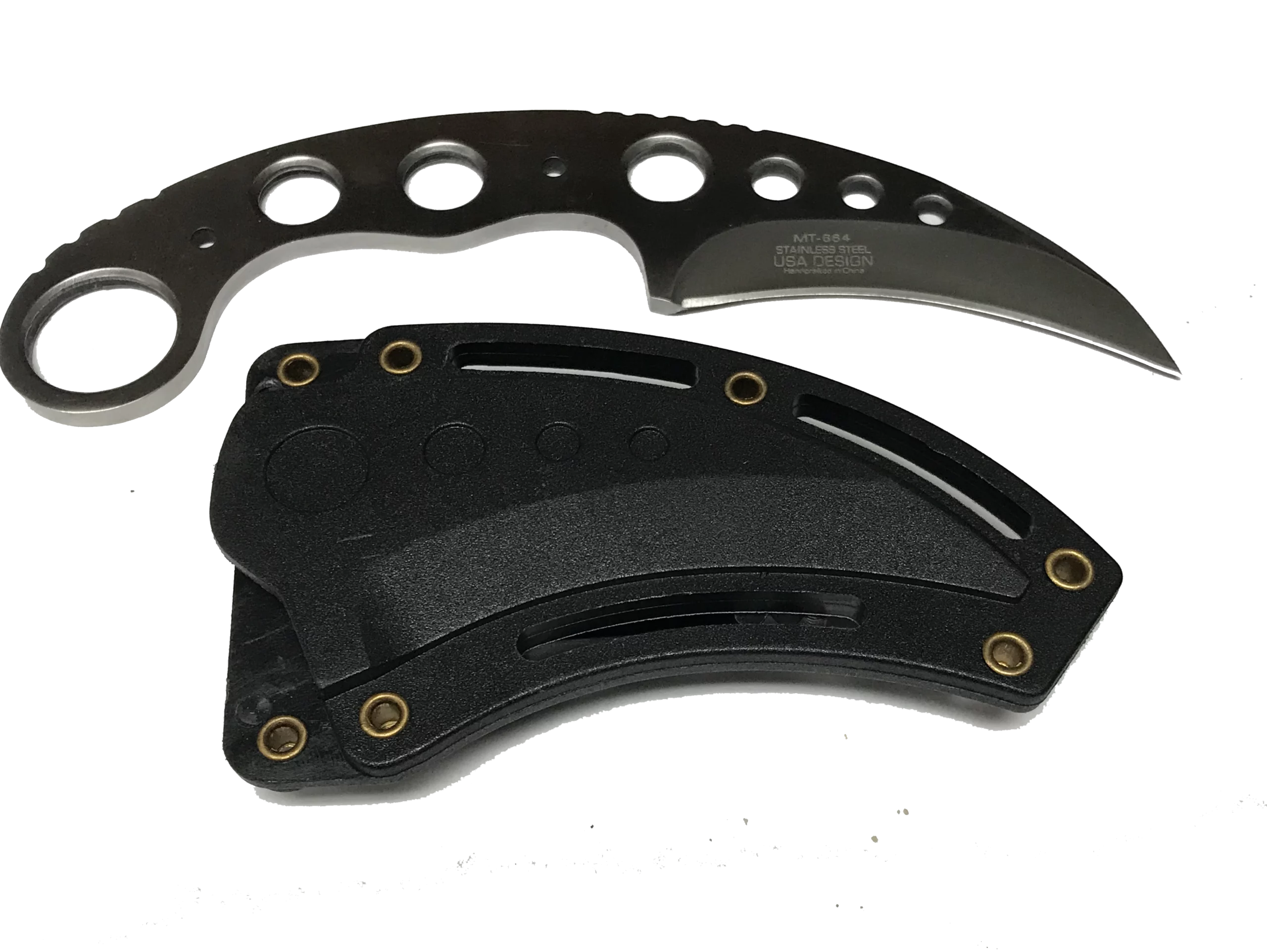 7″ Overall Length. 3.25″ Cutting Edge. Made of 440C stainless steel. Karambit blade with Finger ring. Machined hole cutouts. Black molded plastic belt sheath. Fits up to 1 3/4 Belt