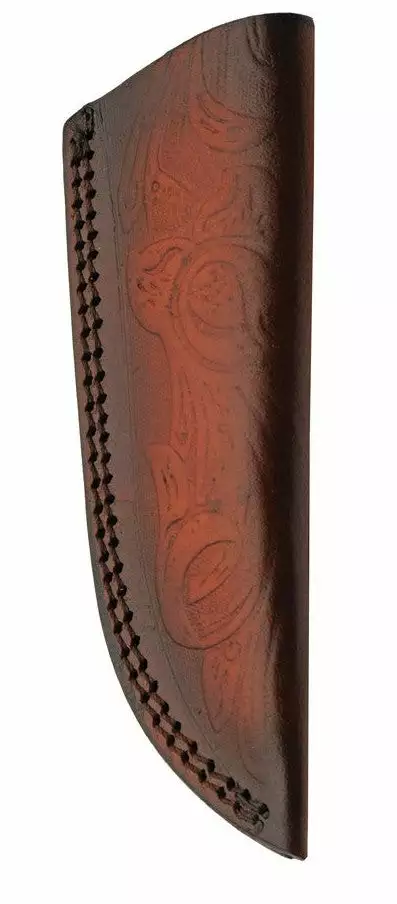 8″ (20.32cm) overall. 3.75″ (9.53cm) Damascus steel blade. Red, white, and blue resin handle. Full tang. Brown leather belt sheath. Carbon Steel Blade. Needs a good sharpening and then it’ll hold an unbelievable edge. Boxed.