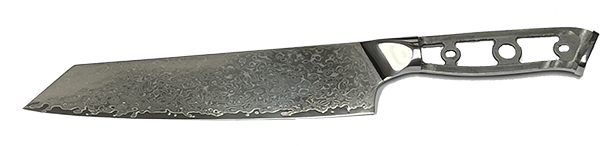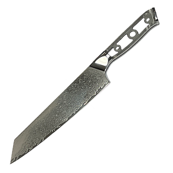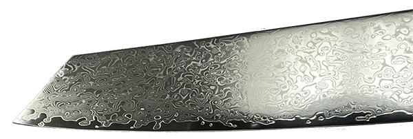Made from folded VG10 this Damascus knife is elegant and unusual. The steel is folded to show a delicate feather on the blade. The knife is polished to a mirror finish not only bringing out the folds but accentuating the hammered area. It’s integrated bolsters provide a smooth, sturdy flow to the handle area. Blank comes in an attractive gift box.ÂÂ