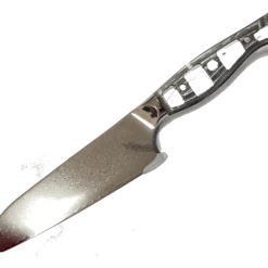 The Sanuku is high end Santoku Chef knife. Made from folded VG10 this Damascus knife is elegant and unusual. The VG10 Damascus Steel is used to provide unsurpassed beauty, sharpness and strength. You will be hard pressed to find as beautiful a knife that will take and hold an edge like this one. After the steel is folded and hammered the knife is polished to a mirror finish not only bringing out the folds but accentuating the hammered areas. It’s integrated bolsters provide a smooth, sturdy flow to the handle area. Blank comes in an attractive gift box.