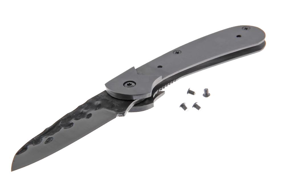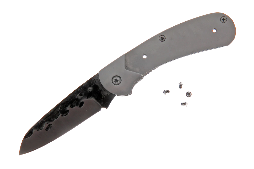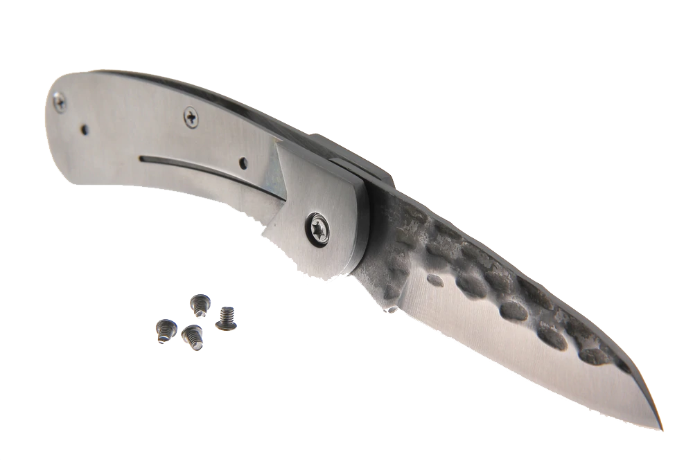 This tough little folder sports an unusual shaped utilitarian blade. The knife just feels right in your hand. The blade has a hammered finish and is made of high quality 7cr17MoV stainless steel with an RC rating of 57-58. Features a polished bolster and heavy steel frame, it comes sharpened and ready to use, just add your handle preference.