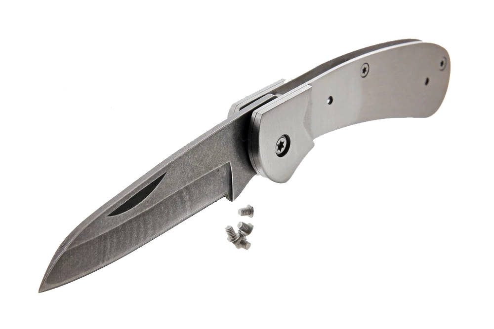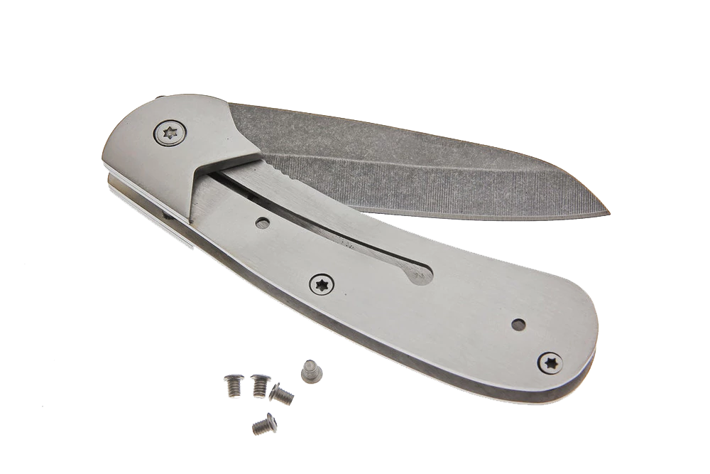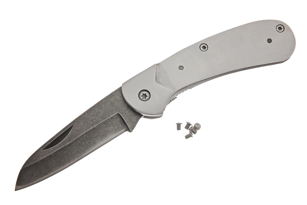 This tough little folder sports an unusual shaped utilitarian blade. The knife just feels right in your hand. The blade has a stone wash finish and is made of high quality 7cr17MoV stainless steel with an RC rating of 57-58. Features a polished bolster and heavy steel frame, it comes sharpened and ready to use, just add your handle preference.